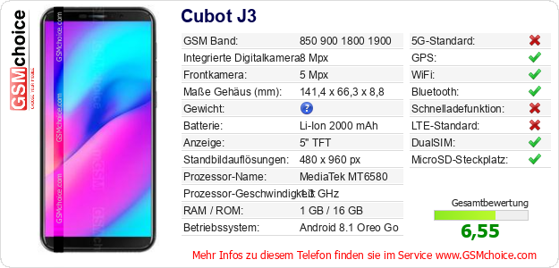 Hast du eigene Webseite? Willst du die Informationen über Standarddaten des Handys Cubot J3 irgendwo veröffentlichen? Das ist sehr einfach. Du kannst das Bild herunterladen oder kopieren und auf der Webseite folgenden Code hinzufügen:Das Einfügen von diesem Code verursacht das Anzeigen von dem folgenden Bild: