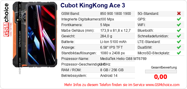 Hast du eigene Webseite? Willst du die Informationen über Standarddaten des Handys Cubot KingKong Ace 3 irgendwo veröffentlichen? Das ist sehr einfach. Du kannst das Bild herunterladen oder kopieren und auf der Webseite folgenden Code hinzufügen:Das Einfügen von diesem Code verursacht das Anzeigen von dem folgenden Bild: