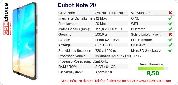 Hast du eigene Webseite? Willst du die Informationen über Standarddaten des Handys Cubot Note 20 irgendwo veröffentlichen? Das ist sehr einfach. Du kannst das Bild herunterladen oder kopieren und auf der Webseite folgenden Code hinzufügen:Das Einfügen von diesem Code verursacht das Anzeigen von dem folgenden Bild: