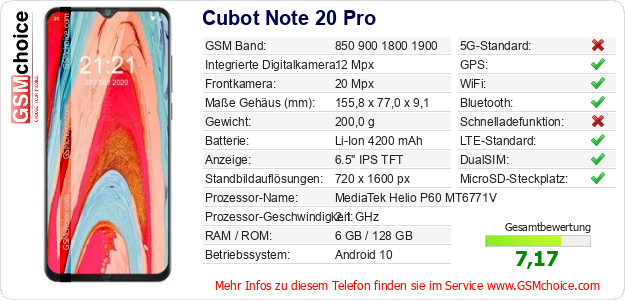 Hast du eigene Webseite? Willst du die Informationen über Standarddaten des Handys Cubot Note 20 Pro irgendwo veröffentlichen? Das ist sehr einfach. Du kannst das Bild herunterladen oder kopieren und auf der Webseite folgenden Code hinzufügen:Das Einfügen von diesem Code verursacht das Anzeigen von dem folgenden Bild: