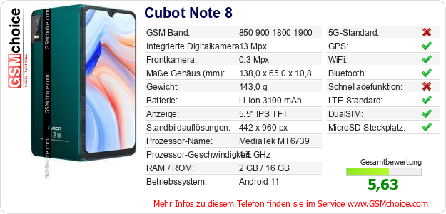 Hast du eigene Webseite? Willst du die Informationen über Standarddaten des Handys Cubot Note 8 irgendwo veröffentlichen? Das ist sehr einfach. Du kannst das Bild herunterladen oder kopieren und auf der Webseite folgenden Code hinzufügen:Das Einfügen von diesem Code verursacht das Anzeigen von dem folgenden Bild: