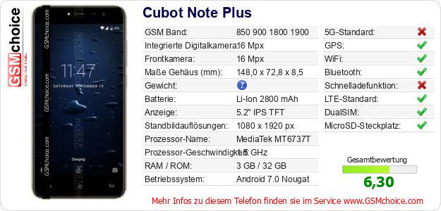Hast du eigene Webseite? Willst du die Informationen über Standarddaten des Handys Cubot Note Plus irgendwo veröffentlichen? Das ist sehr einfach. Du kannst das Bild herunterladen oder kopieren und auf der Webseite folgenden Code hinzufügen:Das Einfügen von diesem Code verursacht das Anzeigen von dem folgenden Bild: