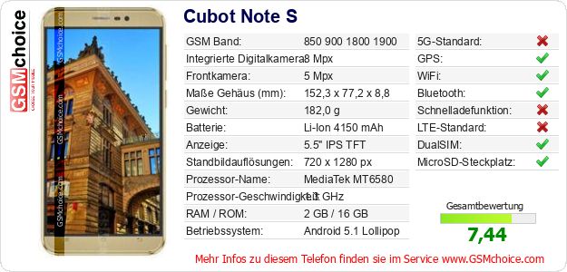 Hast du eigene Webseite? Willst du die Informationen über Standarddaten des Handys Cubot Note S irgendwo veröffentlichen? Das ist sehr einfach. Du kannst das Bild herunterladen oder kopieren und auf der Webseite folgenden Code hinzufügen:Das Einfügen von diesem Code verursacht das Anzeigen von dem folgenden Bild: