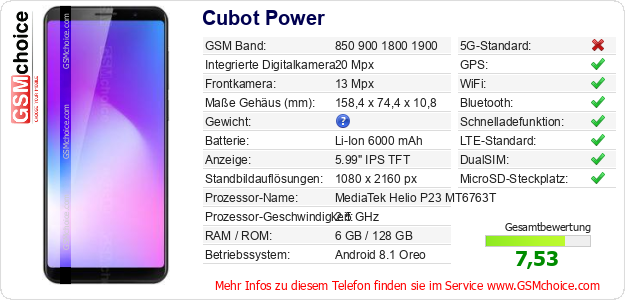 Hast du eigene Webseite? Willst du die Informationen über Standarddaten des Handys Cubot Power irgendwo veröffentlichen? Das ist sehr einfach. Du kannst das Bild herunterladen oder kopieren und auf der Webseite folgenden Code hinzufügen:Das Einfügen von diesem Code verursacht das Anzeigen von dem folgenden Bild: