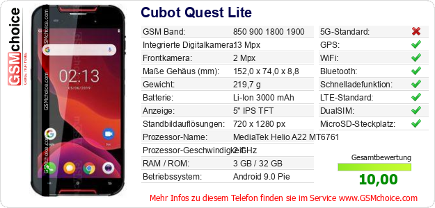 Hast du eigene Webseite? Willst du die Informationen über Standarddaten des Handys Cubot Quest Lite irgendwo veröffentlichen? Das ist sehr einfach. Du kannst das Bild herunterladen oder kopieren und auf der Webseite folgenden Code hinzufügen:Das Einfügen von diesem Code verursacht das Anzeigen von dem folgenden Bild: