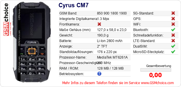 Hast du eigene Webseite? Willst du die Informationen über Standarddaten des Handys Cyrus CM7 irgendwo veröffentlichen? Das ist sehr einfach. Du kannst das Bild herunterladen oder kopieren und auf der Webseite folgenden Code hinzufügen:Das Einfügen von diesem Code verursacht das Anzeigen von dem folgenden Bild:
