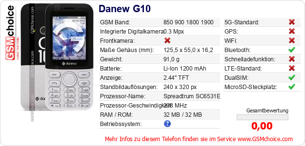 Hast du eigene Webseite? Willst du die Informationen über Standarddaten des Handys Danew G10 irgendwo veröffentlichen? Das ist sehr einfach. Du kannst das Bild herunterladen oder kopieren und auf der Webseite folgenden Code hinzufügen:Das Einfügen von diesem Code verursacht das Anzeigen von dem folgenden Bild: