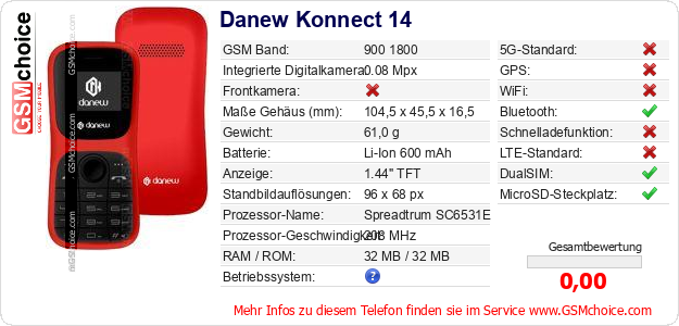 Hast du eigene Webseite? Willst du die Informationen über Standarddaten des Handys Danew Konnect 14 irgendwo veröffentlichen? Das ist sehr einfach. Du kannst das Bild herunterladen oder kopieren und auf der Webseite folgenden Code hinzufügen:Das Einfügen von diesem Code verursacht das Anzeigen von dem folgenden Bild: