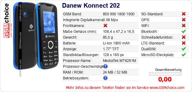 Hast du eigene Webseite? Willst du die Informationen über Standarddaten des Handys Danew Konnect 202 irgendwo veröffentlichen? Das ist sehr einfach. Du kannst das Bild herunterladen oder kopieren und auf der Webseite folgenden Code hinzufügen:Das Einfügen von diesem Code verursacht das Anzeigen von dem folgenden Bild: