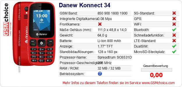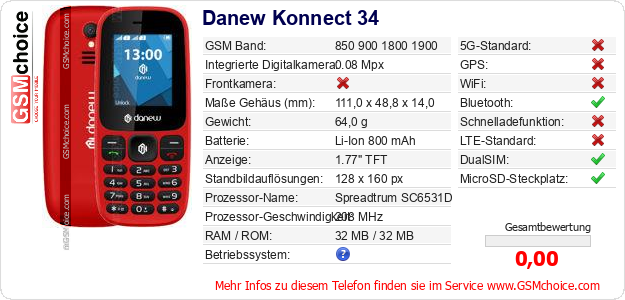 Hast du eigene Webseite? Willst du die Informationen über Standarddaten des Handys Danew Konnect 34 irgendwo veröffentlichen? Das ist sehr einfach. Du kannst das Bild herunterladen oder kopieren und auf der Webseite folgenden Code hinzufügen:Das Einfügen von diesem Code verursacht das Anzeigen von dem folgenden Bild: