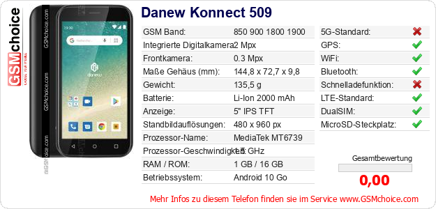 Hast du eigene Webseite? Willst du die Informationen über Standarddaten des Handys Danew Konnect 509 irgendwo veröffentlichen? Das ist sehr einfach. Du kannst das Bild herunterladen oder kopieren und auf der Webseite folgenden Code hinzufügen:Das Einfügen von diesem Code verursacht das Anzeigen von dem folgenden Bild: