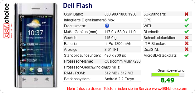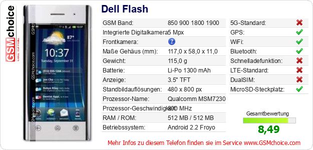 Hast du eigene Webseite? Willst du die Informationen über Standarddaten des Handys Dell Flash irgendwo veröffentlichen? Das ist sehr einfach. Du kannst das Bild herunterladen oder kopieren und auf der Webseite folgenden Code hinzufügen:Das Einfügen von diesem Code verursacht das Anzeigen von dem folgenden Bild: