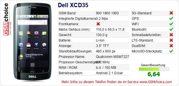 Hast du eigene Webseite? Willst du die Informationen über Standarddaten des Handys Dell XCD35 irgendwo veröffentlichen? Das ist sehr einfach. Du kannst das Bild herunterladen oder kopieren und auf der Webseite folgenden Code hinzufügen:Das Einfügen von diesem Code verursacht das Anzeigen von dem folgenden Bild: