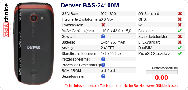 Hast du eigene Webseite? Willst du die Informationen über Standarddaten des Handys Denver BAS-24100M irgendwo veröffentlichen? Das ist sehr einfach. Du kannst das Bild herunterladen oder kopieren und auf der Webseite folgenden Code hinzufügen:Das Einfügen von diesem Code verursacht das Anzeigen von dem folgenden Bild: