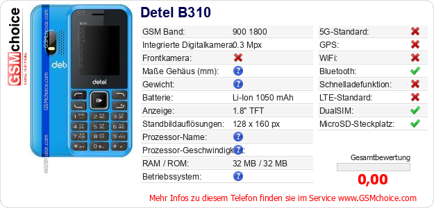 Hast du eigene Webseite? Willst du die Informationen über Standarddaten des Handys Detel B310 irgendwo veröffentlichen? Das ist sehr einfach. Du kannst das Bild herunterladen oder kopieren und auf der Webseite folgenden Code hinzufügen:Das Einfügen von diesem Code verursacht das Anzeigen von dem folgenden Bild: