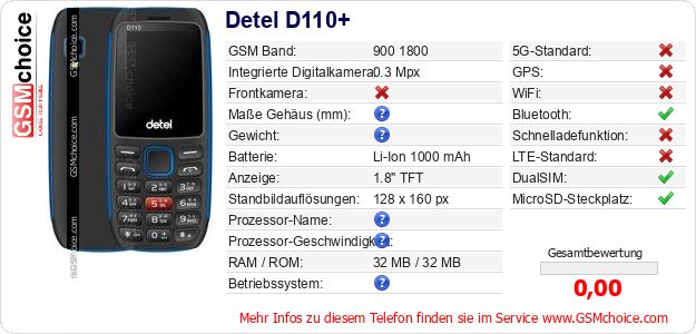 Hast du eigene Webseite? Willst du die Informationen über Standarddaten des Handys Detel D110+ irgendwo veröffentlichen? Das ist sehr einfach. Du kannst das Bild herunterladen oder kopieren und auf der Webseite folgenden Code hinzufügen:Das Einfügen von diesem Code verursacht das Anzeigen von dem folgenden Bild: