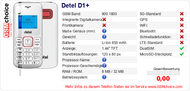Hast du eigene Webseite? Willst du die Informationen über Standarddaten des Handys Detel D1+ irgendwo veröffentlichen? Das ist sehr einfach. Du kannst das Bild herunterladen oder kopieren und auf der Webseite folgenden Code hinzufügen:Das Einfügen von diesem Code verursacht das Anzeigen von dem folgenden Bild:
