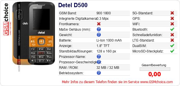 Hast du eigene Webseite? Willst du die Informationen über Standarddaten des Handys Detel D500 irgendwo veröffentlichen? Das ist sehr einfach. Du kannst das Bild herunterladen oder kopieren und auf der Webseite folgenden Code hinzufügen:Das Einfügen von diesem Code verursacht das Anzeigen von dem folgenden Bild: