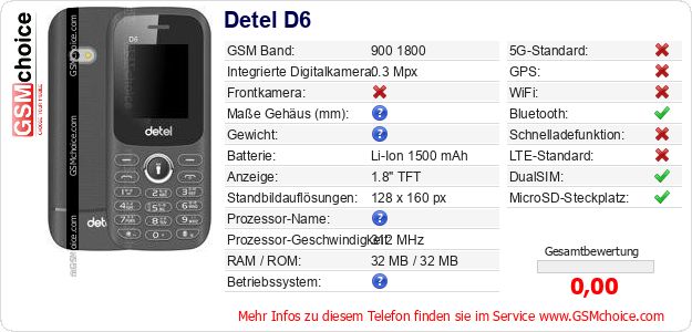 Hast du eigene Webseite? Willst du die Informationen über Standarddaten des Handys Detel D6 irgendwo veröffentlichen? Das ist sehr einfach. Du kannst das Bild herunterladen oder kopieren und auf der Webseite folgenden Code hinzufügen:Das Einfügen von diesem Code verursacht das Anzeigen von dem folgenden Bild: