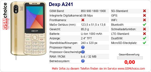 Hast du eigene Webseite? Willst du die Informationen über Standarddaten des Handys Dexp A241 irgendwo veröffentlichen? Das ist sehr einfach. Du kannst das Bild herunterladen oder kopieren und auf der Webseite folgenden Code hinzufügen:Das Einfügen von diesem Code verursacht das Anzeigen von dem folgenden Bild: