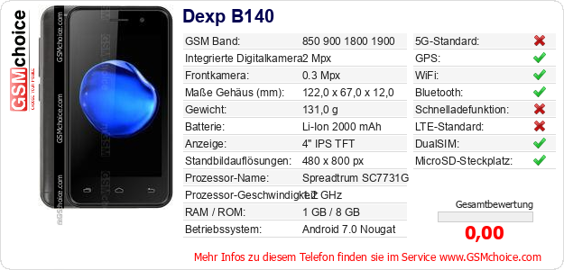 Hast du eigene Webseite? Willst du die Informationen über Standarddaten des Handys Dexp B140 irgendwo veröffentlichen? Das ist sehr einfach. Du kannst das Bild herunterladen oder kopieren und auf der Webseite folgenden Code hinzufügen:Das Einfügen von diesem Code verursacht das Anzeigen von dem folgenden Bild: