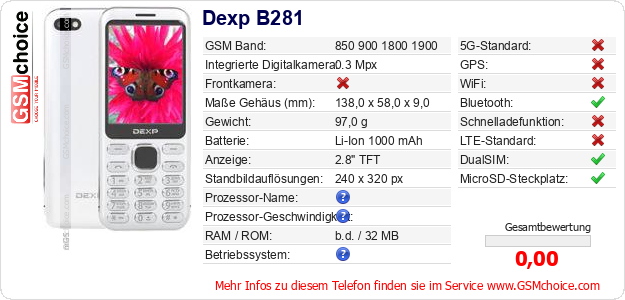 Hast du eigene Webseite? Willst du die Informationen über Standarddaten des Handys Dexp B281 irgendwo veröffentlichen? Das ist sehr einfach. Du kannst das Bild herunterladen oder kopieren und auf der Webseite folgenden Code hinzufügen:Das Einfügen von diesem Code verursacht das Anzeigen von dem folgenden Bild: