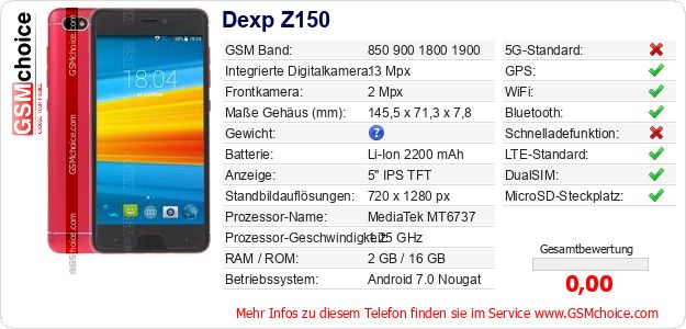 Hast du eigene Webseite? Willst du die Informationen über Standarddaten des Handys Dexp Z150 irgendwo veröffentlichen? Das ist sehr einfach. Du kannst das Bild herunterladen oder kopieren und auf der Webseite folgenden Code hinzufügen:Das Einfügen von diesem Code verursacht das Anzeigen von dem folgenden Bild: