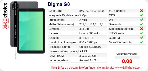 Hast du eigene Webseite? Willst du die Informationen über Standarddaten des Handys Digma G8 irgendwo veröffentlichen? Das ist sehr einfach. Du kannst das Bild herunterladen oder kopieren und auf der Webseite folgenden Code hinzufügen:Das Einfügen von diesem Code verursacht das Anzeigen von dem folgenden Bild: