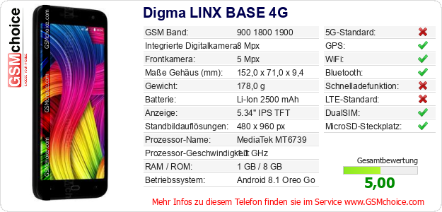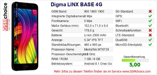 Hast du eigene Webseite? Willst du die Informationen über Standarddaten des Handys Digma LINX BASE 4G irgendwo veröffentlichen? Das ist sehr einfach. Du kannst das Bild herunterladen oder kopieren und auf der Webseite folgenden Code hinzufügen:Das Einfügen von diesem Code verursacht das Anzeigen von dem folgenden Bild: