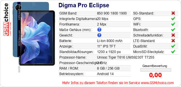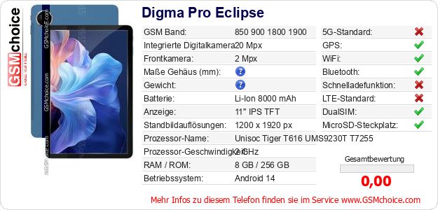 Hast du eigene Webseite? Willst du die Informationen über Standarddaten des Handys Digma Pro Eclipse irgendwo veröffentlichen? Das ist sehr einfach. Du kannst das Bild herunterladen oder kopieren und auf der Webseite folgenden Code hinzufügen:Das Einfügen von diesem Code verursacht das Anzeigen von dem folgenden Bild: