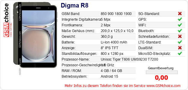 Hast du eigene Webseite? Willst du die Informationen über Standarddaten des Handys Digma R8 irgendwo veröffentlichen? Das ist sehr einfach. Du kannst das Bild herunterladen oder kopieren und auf der Webseite folgenden Code hinzufügen:Das Einfügen von diesem Code verursacht das Anzeigen von dem folgenden Bild: