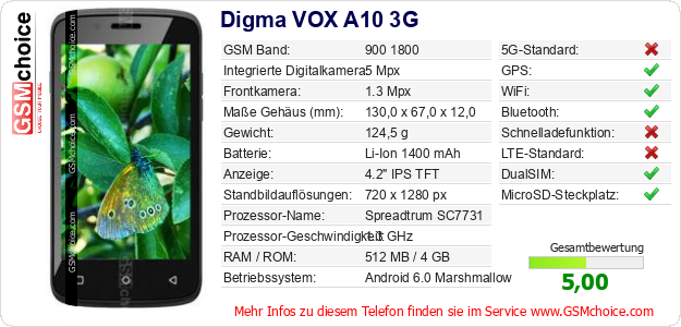 Hast du eigene Webseite? Willst du die Informationen über Standarddaten des Handys Digma VOX A10 3G irgendwo veröffentlichen? Das ist sehr einfach. Du kannst das Bild herunterladen oder kopieren und auf der Webseite folgenden Code hinzufügen:Das Einfügen von diesem Code verursacht das Anzeigen von dem folgenden Bild: