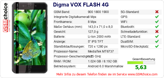 Hast du eigene Webseite? Willst du die Informationen über Standarddaten des Handys Digma VOX FLASH 4G irgendwo veröffentlichen? Das ist sehr einfach. Du kannst das Bild herunterladen oder kopieren und auf der Webseite folgenden Code hinzufügen:Das Einfügen von diesem Code verursacht das Anzeigen von dem folgenden Bild:
