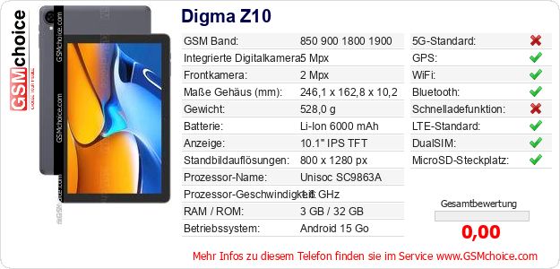Hast du eigene Webseite? Willst du die Informationen über Standarddaten des Handys Digma Z10 irgendwo veröffentlichen? Das ist sehr einfach. Du kannst das Bild herunterladen oder kopieren und auf der Webseite folgenden Code hinzufügen:Das Einfügen von diesem Code verursacht das Anzeigen von dem folgenden Bild: