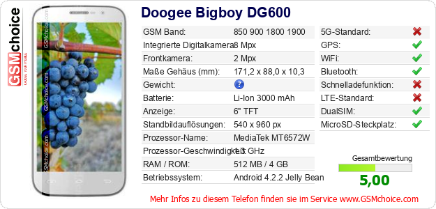 Hast du eigene Webseite? Willst du die Informationen über Standarddaten des Handys Doogee Bigboy DG600 irgendwo veröffentlichen? Das ist sehr einfach. Du kannst das Bild herunterladen oder kopieren und auf der Webseite folgenden Code hinzufügen:Das Einfügen von diesem Code verursacht das Anzeigen von dem folgenden Bild: