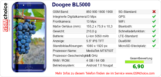 Hast du eigene Webseite? Willst du die Informationen über Standarddaten des Handys Doogee BL5000 irgendwo veröffentlichen? Das ist sehr einfach. Du kannst das Bild herunterladen oder kopieren und auf der Webseite folgenden Code hinzufügen:Das Einfügen von diesem Code verursacht das Anzeigen von dem folgenden Bild: