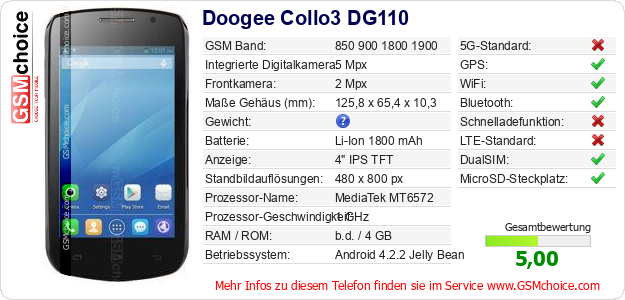 Hast du eigene Webseite? Willst du die Informationen über Standarddaten des Handys Doogee Collo3 DG110 irgendwo veröffentlichen? Das ist sehr einfach. Du kannst das Bild herunterladen oder kopieren und auf der Webseite folgenden Code hinzufügen:Das Einfügen von diesem Code verursacht das Anzeigen von dem folgenden Bild: