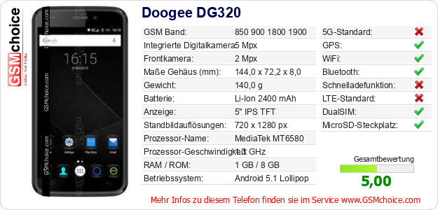 Hast du eigene Webseite? Willst du die Informationen über Standarddaten des Handys Doogee DG320 irgendwo veröffentlichen? Das ist sehr einfach. Du kannst das Bild herunterladen oder kopieren und auf der Webseite folgenden Code hinzufügen:Das Einfügen von diesem Code verursacht das Anzeigen von dem folgenden Bild: