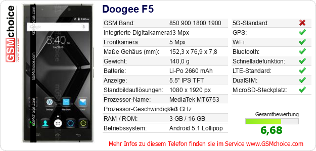 Hast du eigene Webseite? Willst du die Informationen über Standarddaten des Handys Doogee F5 irgendwo veröffentlichen? Das ist sehr einfach. Du kannst das Bild herunterladen oder kopieren und auf der Webseite folgenden Code hinzufügen:Das Einfügen von diesem Code verursacht das Anzeigen von dem folgenden Bild: