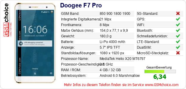 Hast du eigene Webseite? Willst du die Informationen über Standarddaten des Handys Doogee F7 Pro irgendwo veröffentlichen? Das ist sehr einfach. Du kannst das Bild herunterladen oder kopieren und auf der Webseite folgenden Code hinzufügen:Das Einfügen von diesem Code verursacht das Anzeigen von dem folgenden Bild: