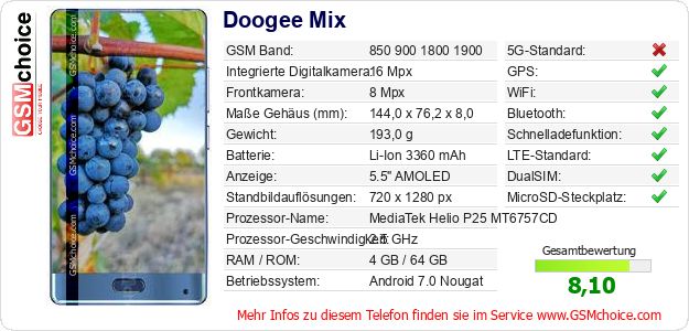 Hast du eigene Webseite? Willst du die Informationen über Standarddaten des Handys Doogee Mix irgendwo veröffentlichen? Das ist sehr einfach. Du kannst das Bild herunterladen oder kopieren und auf der Webseite folgenden Code hinzufügen:Das Einfügen von diesem Code verursacht das Anzeigen von dem folgenden Bild: