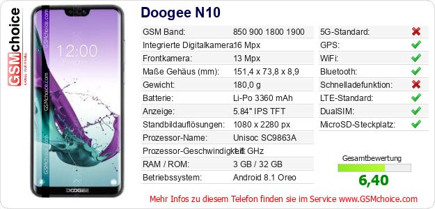 Hast du eigene Webseite? Willst du die Informationen über Standarddaten des Handys Doogee N10 irgendwo veröffentlichen? Das ist sehr einfach. Du kannst das Bild herunterladen oder kopieren und auf der Webseite folgenden Code hinzufügen:Das Einfügen von diesem Code verursacht das Anzeigen von dem folgenden Bild: