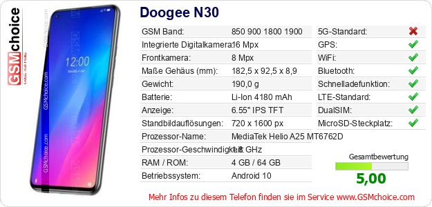 Hast du eigene Webseite? Willst du die Informationen über Standarddaten des Handys Doogee N30 irgendwo veröffentlichen? Das ist sehr einfach. Du kannst das Bild herunterladen oder kopieren und auf der Webseite folgenden Code hinzufügen:Das Einfügen von diesem Code verursacht das Anzeigen von dem folgenden Bild: