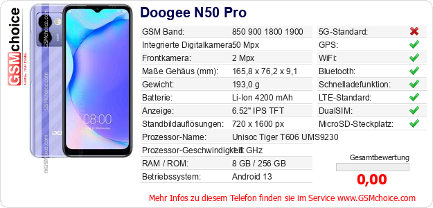 Daten des Mobiltelefons Doogee N50 Pro auf Ihrer Seite