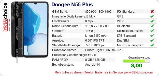 Daten des Mobiltelefons Doogee N55 Plus auf Ihrer Seite