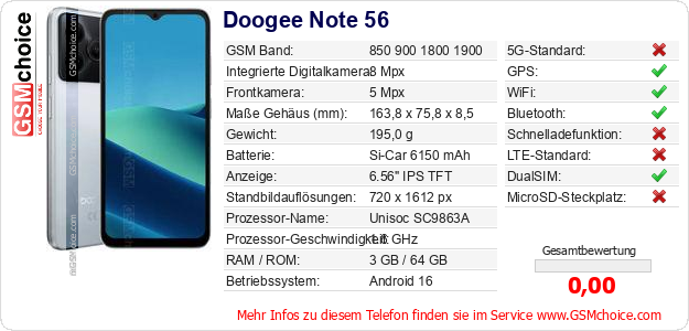 Hast du eigene Webseite? Willst du die Informationen über Standarddaten des Handys Doogee Note 56 irgendwo veröffentlichen? Das ist sehr einfach. Du kannst das Bild herunterladen oder kopieren und auf der Webseite folgenden Code hinzufügen:Das Einfügen von diesem Code verursacht das Anzeigen von dem folgenden Bild: