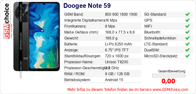Hast du eigene Webseite? Willst du die Informationen über Standarddaten des Handys Doogee Note 59 irgendwo veröffentlichen? Das ist sehr einfach. Du kannst das Bild herunterladen oder kopieren und auf der Webseite folgenden Code hinzufügen:Das Einfügen von diesem Code verursacht das Anzeigen von dem folgenden Bild: