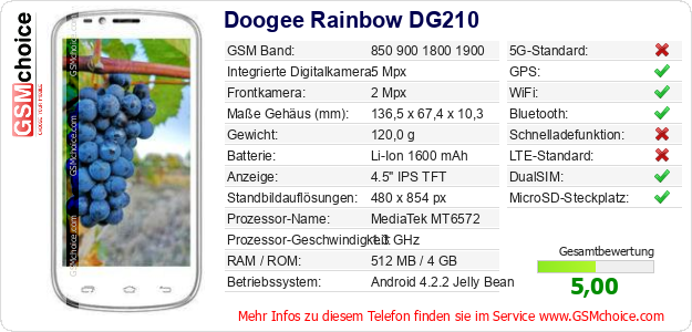 Hast du eigene Webseite? Willst du die Informationen über Standarddaten des Handys Doogee Rainbow DG210 irgendwo veröffentlichen? Das ist sehr einfach. Du kannst das Bild herunterladen oder kopieren und auf der Webseite folgenden Code hinzufügen:Das Einfügen von diesem Code verursacht das Anzeigen von dem folgenden Bild:
