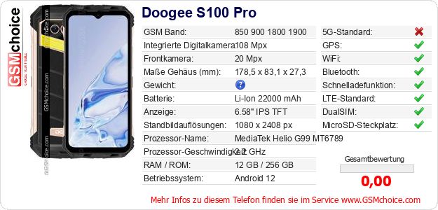 Daten des Mobiltelefons Doogee S100 Pro auf Ihrer Seite