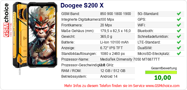 Hast du eigene Webseite? Willst du die Informationen über Standarddaten des Handys Doogee S200 X irgendwo veröffentlichen? Das ist sehr einfach. Du kannst das Bild herunterladen oder kopieren und auf der Webseite folgenden Code hinzufügen:Das Einfügen von diesem Code verursacht das Anzeigen von dem folgenden Bild: